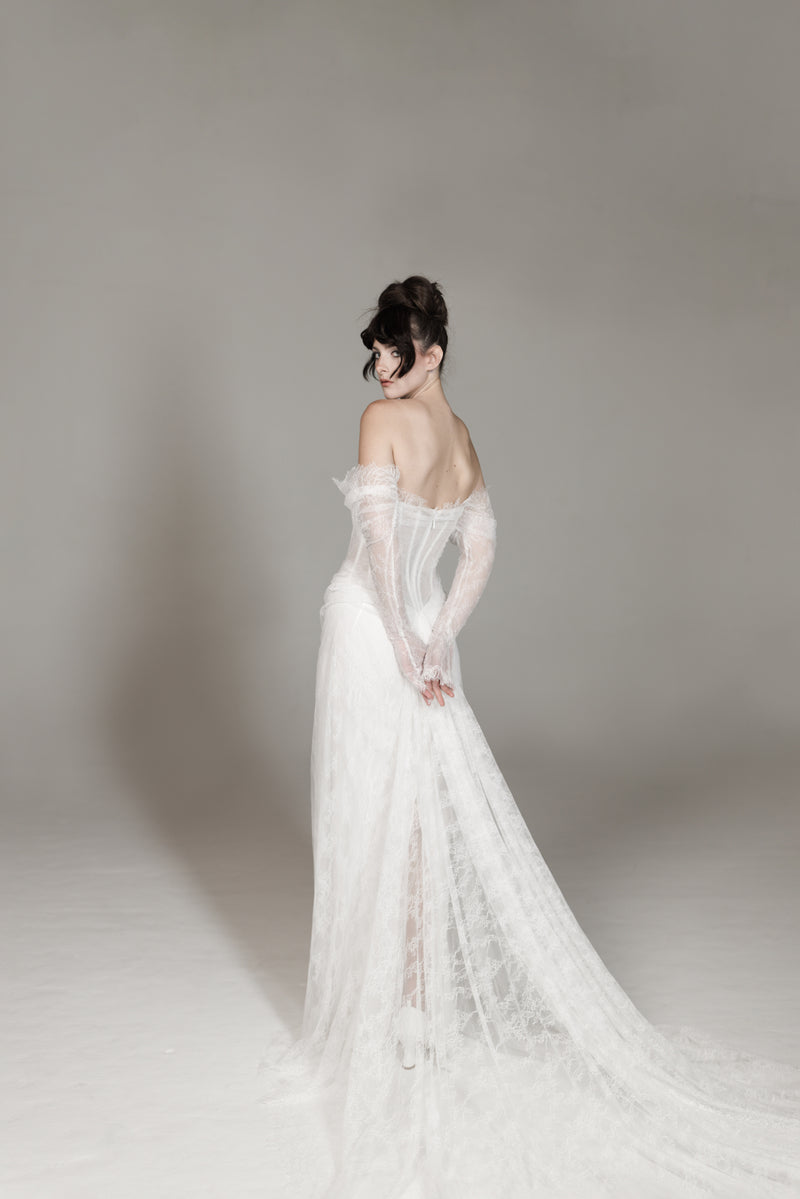 Removable draped lattice Chantilly sleeve. Attaches to bodice with a hook/thread loop.