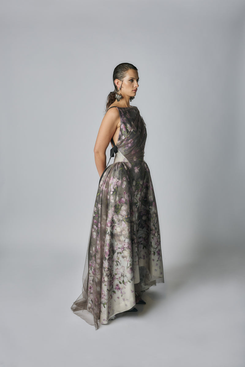Ombré rose printed gown with hand draped tulle overlay. Square neck with grosgrain straps that cascade into a deep V at back. Invisible zipper closure at center back.