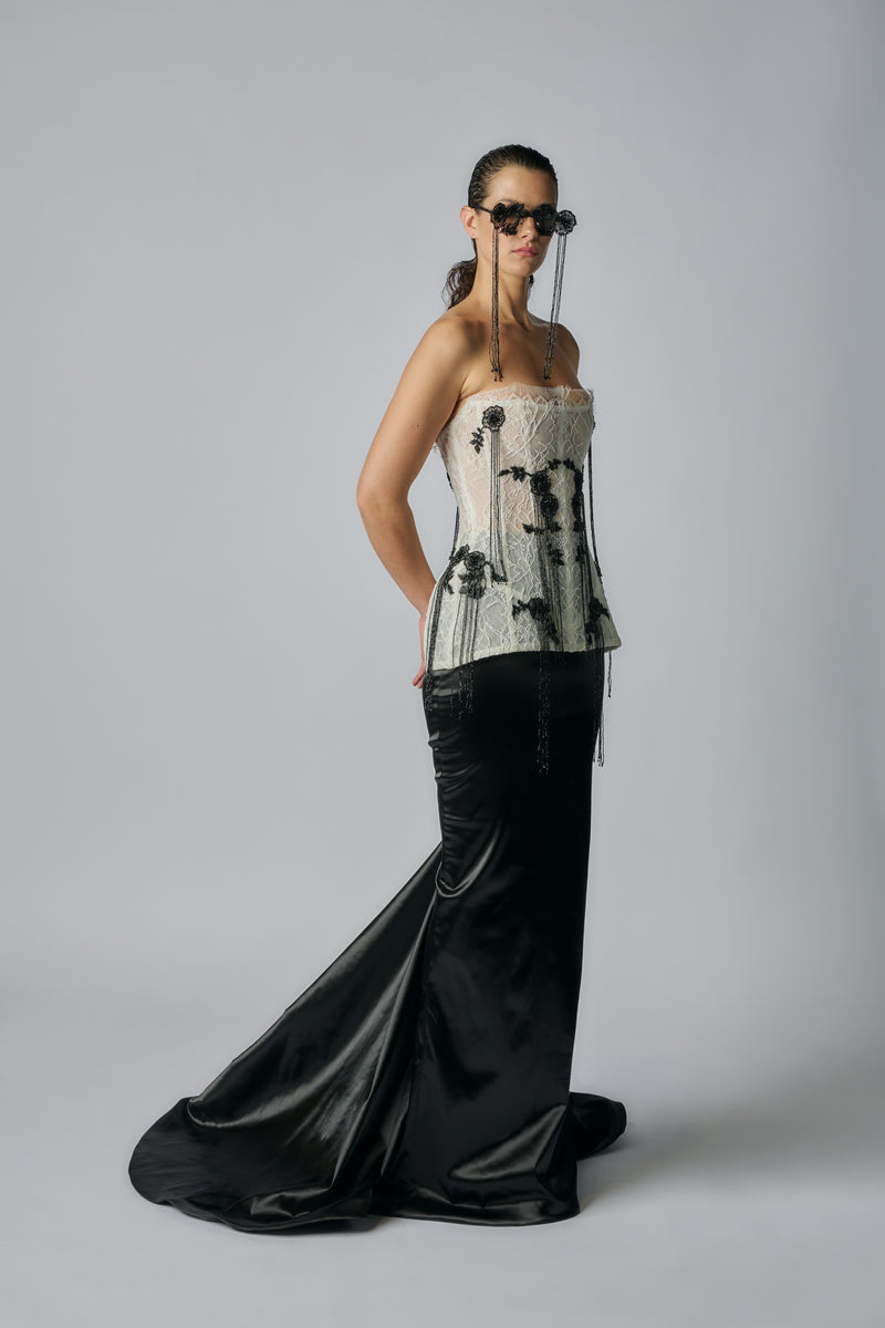 Strapless mirrored lace pannier corset. Decorated with handmade floral glass bead appliqués. Invisible zipper closure at center back.