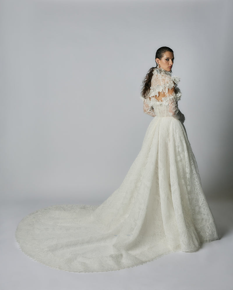 Re-embroidered lace ball gown with basque waist. Boned internal corset, soft tulle hip pads, and invisible zipper closure at center back.