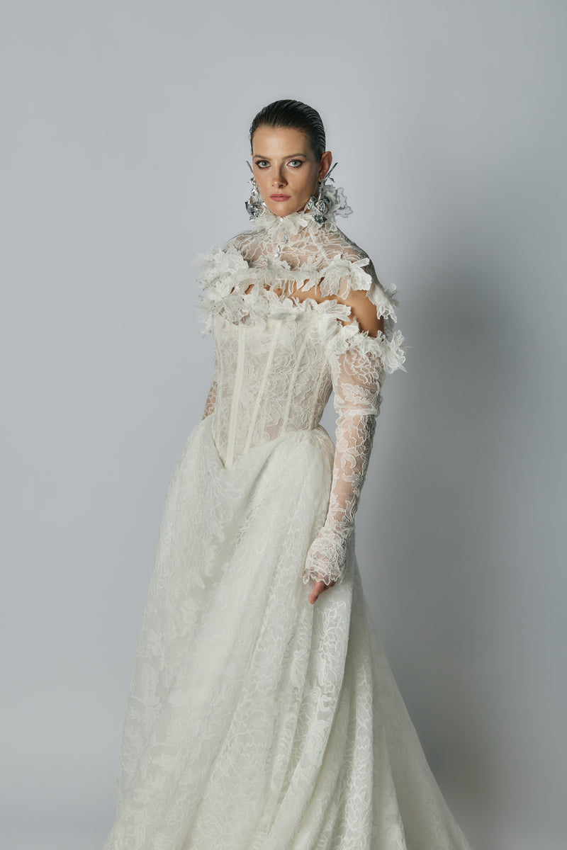 Re-embroidered lace bodysuit decorated with wispy floral appliques all around neckline. Full button adornment on sleeve with covered button and loop closure at cuff. Invisible zipper closure at center back.