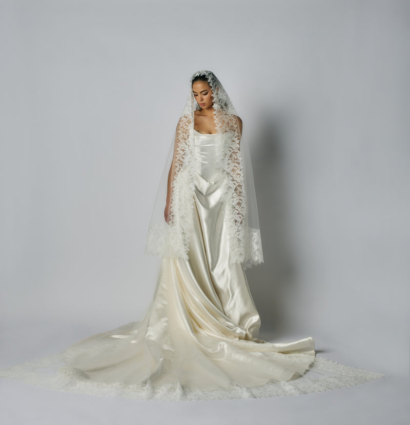 Italian satin, strapless ball gown with draped bodice and basque waist.