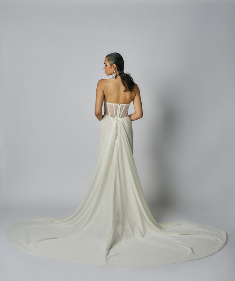 Porcelain organza gown with hand draped bodice and basque waist. Internal boned corset. Invisible zipper closure at center back.